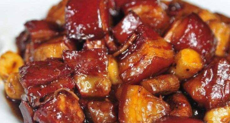 红烧肉:锅中倒入油,趁油凉时放入桂皮和八角用小火炒出香味后,改成大火,倒入五花肉翻炒变色后,继续煸炒直到出油。倒入老抽、糖和盐,把所有调料炒拌均匀后,继续翻炒5分钟,然后倒入没过肉面的开水,撇去浮沫。放入姜片,盖盖子,转小火炖40分钟。打开盖子,收汤即可。