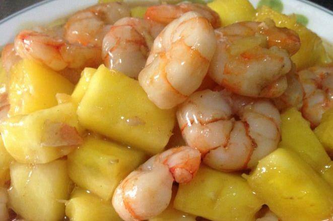 菠萝虾球:姜、葱洗净切末备用;菠萝小丁块放入淡盐水中浸泡一会儿、控干水;虾洗净、剥皮、去虾线备用;小碗中放入水、淀粉、糖、盐、蒸鱼豉油、蚝油调成碗汁;锅中放油、油热后,放入姜末、虾煸炒一下、虾形状变成圆形放入菠萝炒炒出果香;放入碗汁,汤汁粘稠出锅即可。这道菜酸甜可口,非常受小朋友的欢迎。
