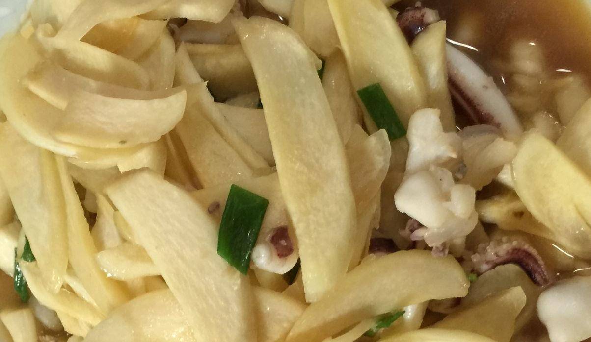 鱿鱼炒茭白:鱿鱼洗净切成丝,茭白洗净切片备用;锅内倒入适量的食用油加热。放入葱白、姜片、蒜头片炒香;倒入鱿鱼丝翻炒,加入茭白片继续翻炒;加入适量的黃酒,然后加适量的水、酱油;待锅内水开后,加入葱花拌匀就可以开吃啦。