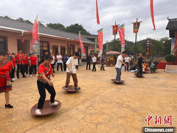 游客正在体验畲族传统体育项目“摇锅”。参赛者运用身体重心的变化将锅向指定方向移动,过终点线为胜。 钟平 摄