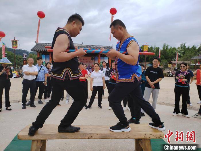 游客正在观看畲族“抄竹竿”。参赛者手持竹杠,采用推、拉、拧、顶、拔等方法,设法将对方推或拉下凳为胜。 刘星蔚 摄
