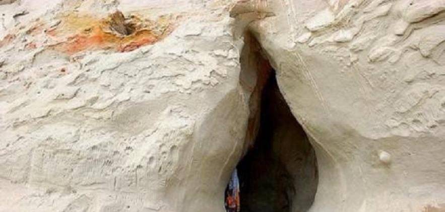 不规则的三角形门洞看起来像是人工开凿的一样。洞穴内部都是一样质地的沙子,但诡异的是,洞内有一个直径约40厘米的铁管从山顶插入,穿透山体通入洞中。