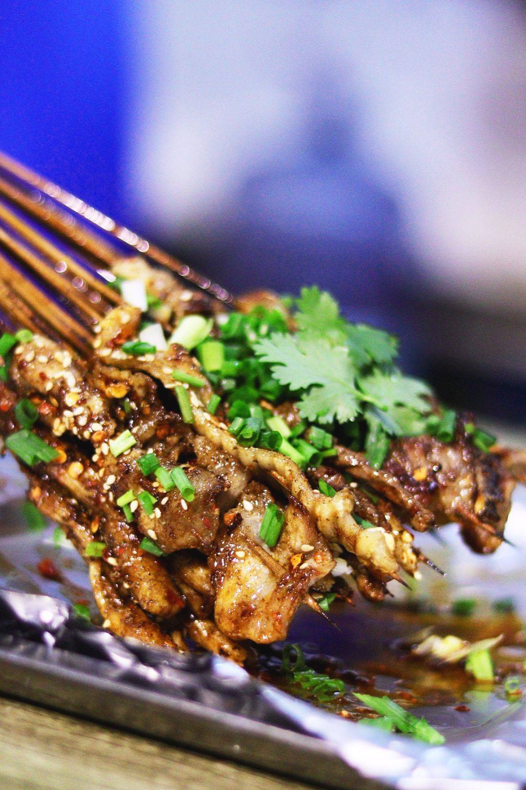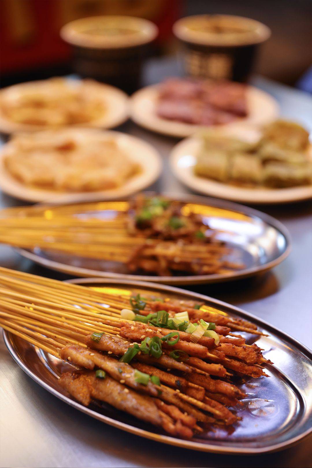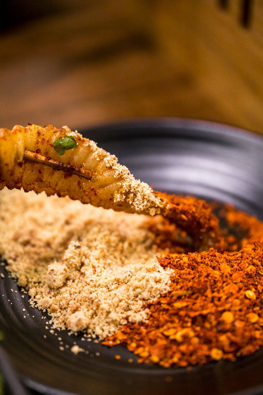 烤好临上桌前,还要撒上大把的调味料,先撒海椒,再撒葱花,吃之前要蘸蘸料,蘸料有干辣椒粉,花生黄豆面和醋碟三种,一根根烤串,层层叠加的酱料,不再是单纯的烧烤,而是重调味的川菜的缩影。