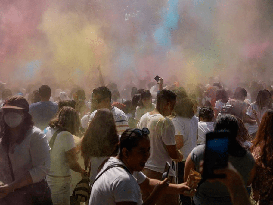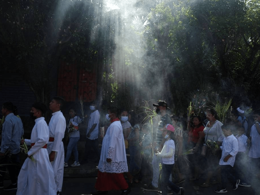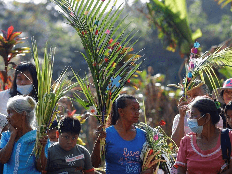 萨尔瓦多纳慧扎尔克,天主教信徒手拿棕榈叶参加卡维理欧教堂举行的棕枝主日游行活动。