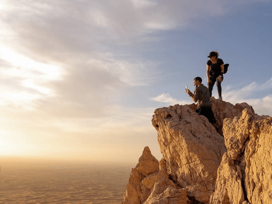 两名徒步旅行者在化石岩自然保护区拍摄日落照片。