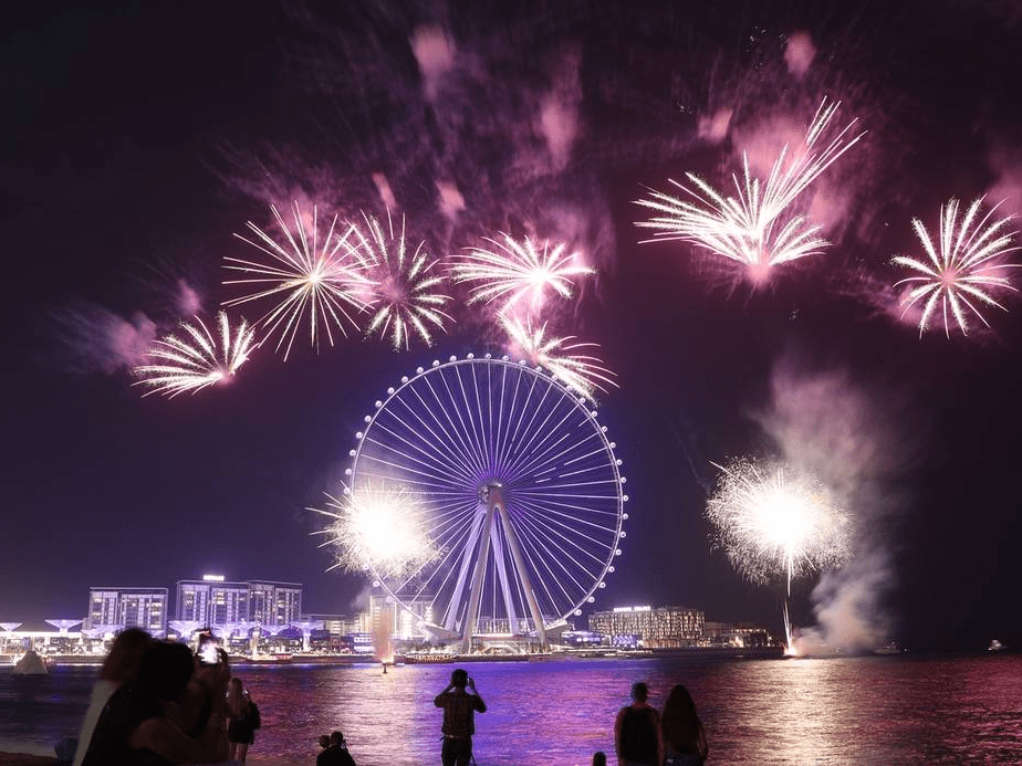 烟花在朱美拉海滩住宅区和蓝水岛的夜空中绽放。