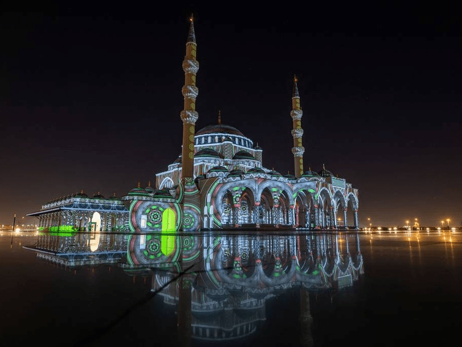 阿联酋沙迦,2023年沙迦灯光节举行,阿尔诺尔清真寺被灯光照亮。