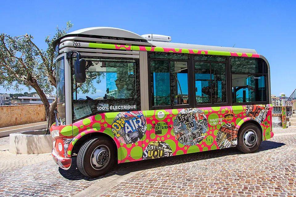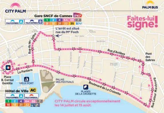 CITY PALM城市摆渡车,连接起了戛纳沿海的许多主要景点。在道路上看到蓝色的线就是摆渡大巴的行进路线了。如果在人行道上遇到了蓝色的柱子,标志着这里是摆渡大巴的停靠地点,向司机发出信号,司机就会停车。只需0.8欧元,即可在一天内不限次乘坐。
