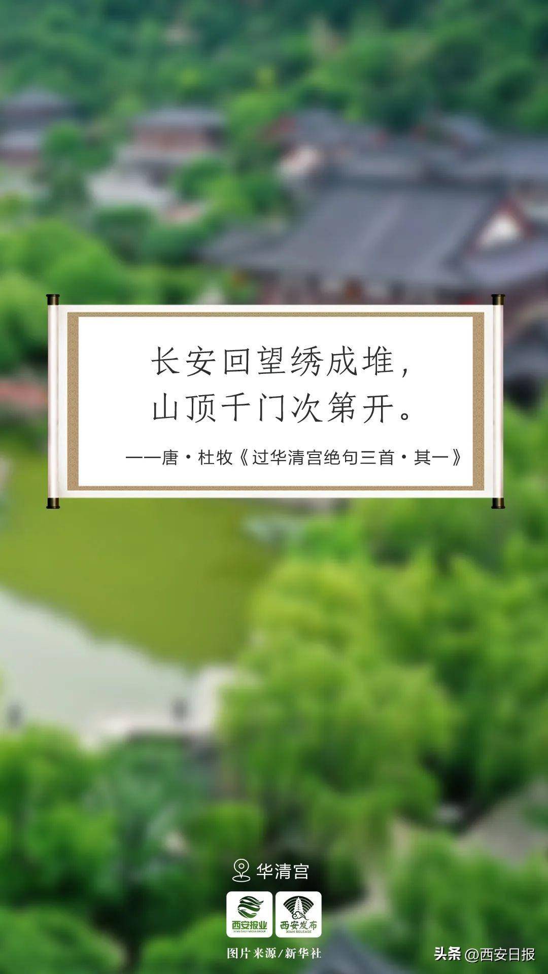 骊山因景色翠秀,美如锦绣,故又名“绣岭”。华清宫倚骊峰山势而筑,规模宏大,建筑壮丽。时至今日,登上骊山,只需一个回眸,长安即若隐若现。