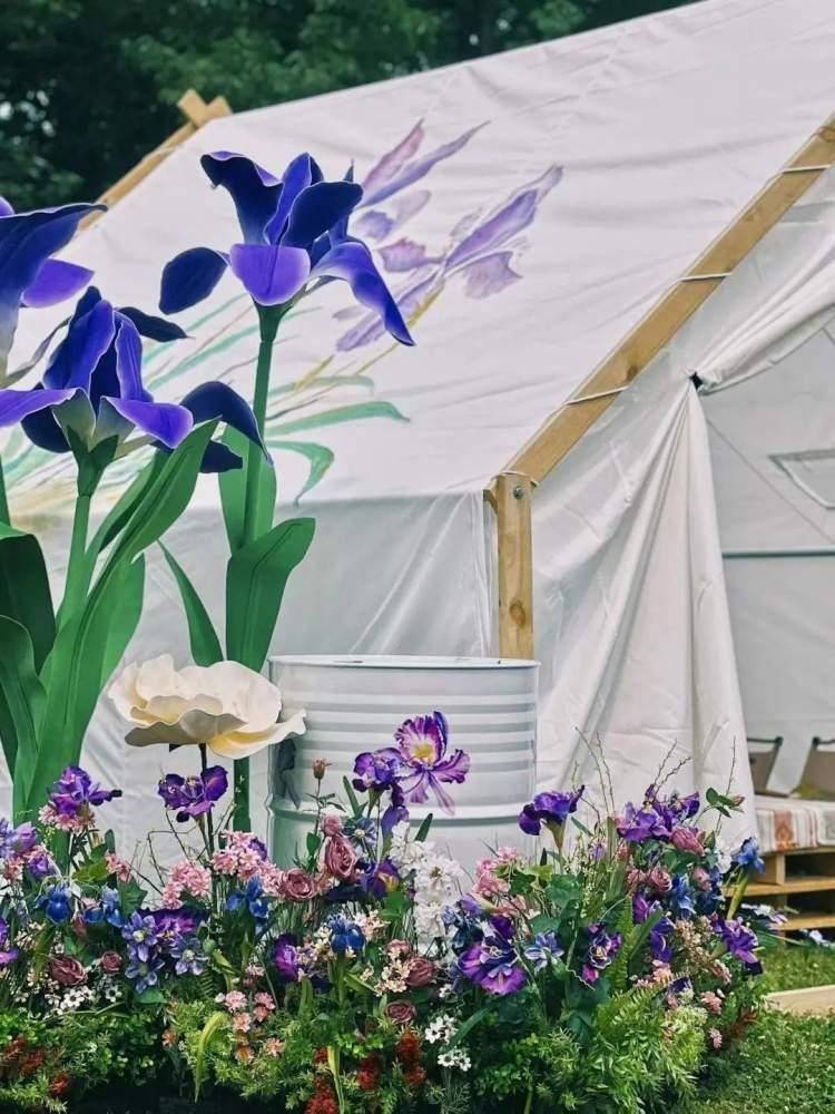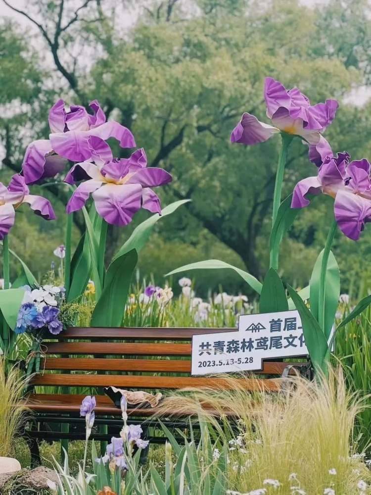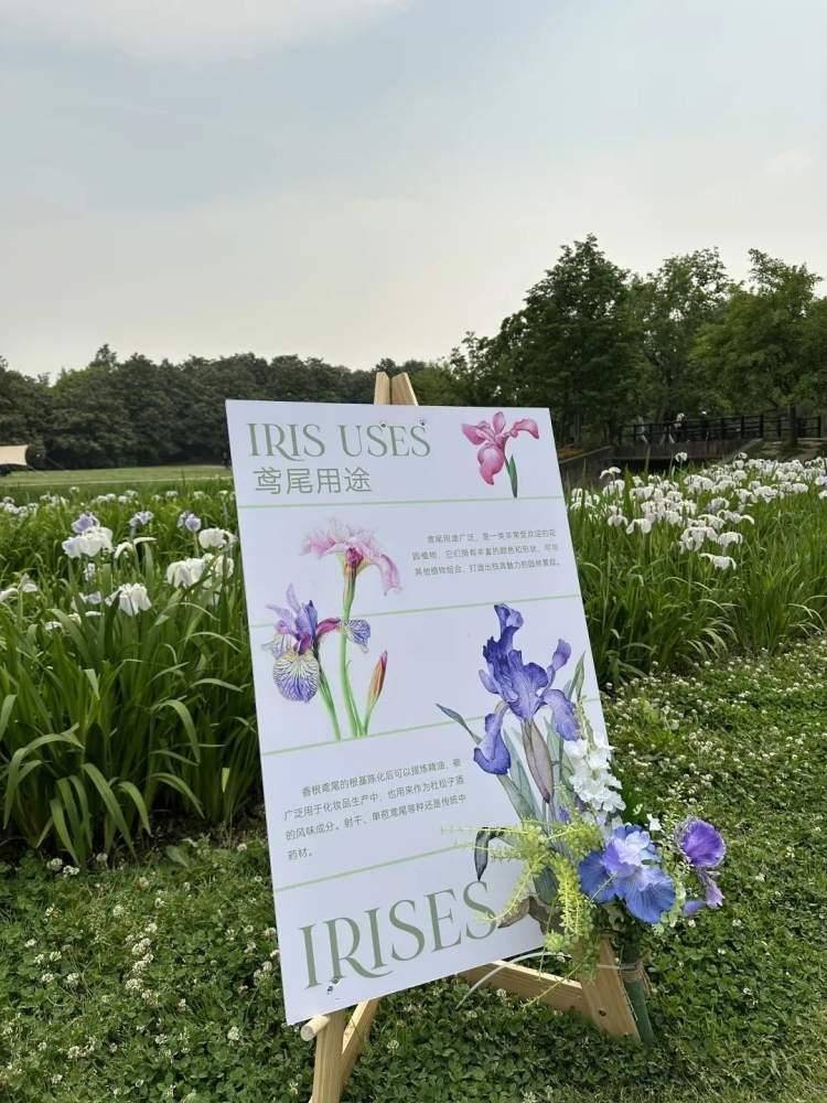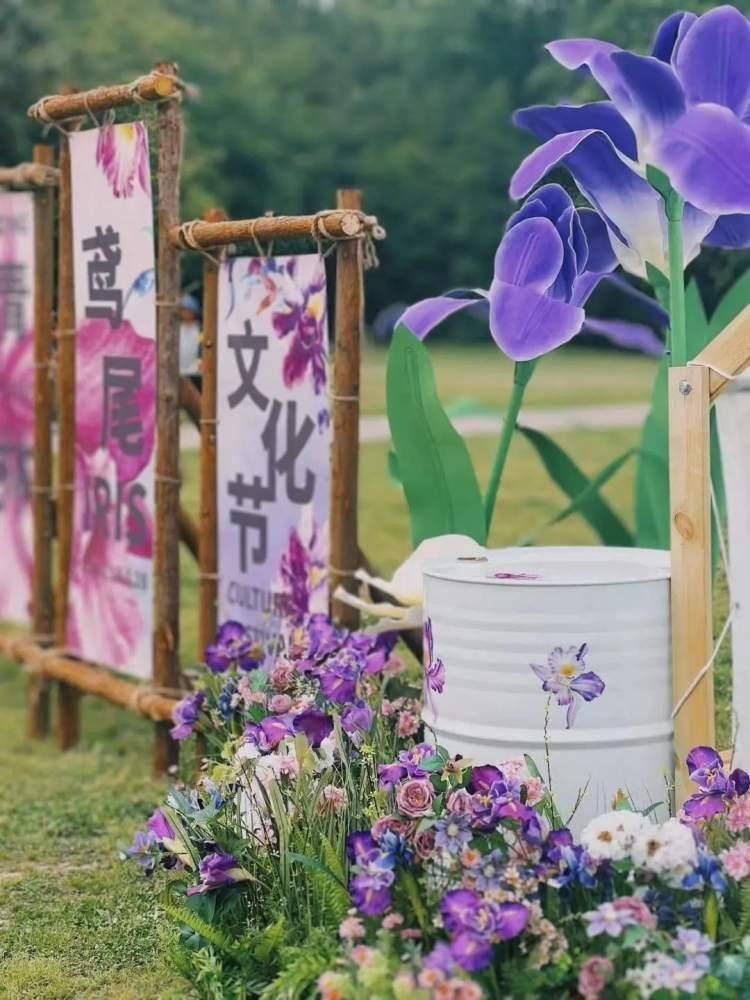 为了让市民游客能够更好地了解鸢尾文化,感受自然与人文之美,共青森林公园在华明桥附近搭建鸢尾文化节主题展区,通过科普文化展板、丰富的鸢尾花卉品种展示、手绘鸢尾露营帐篷、鸢尾打卡椅等创意布景,营造优雅与野趣的独特氛围。