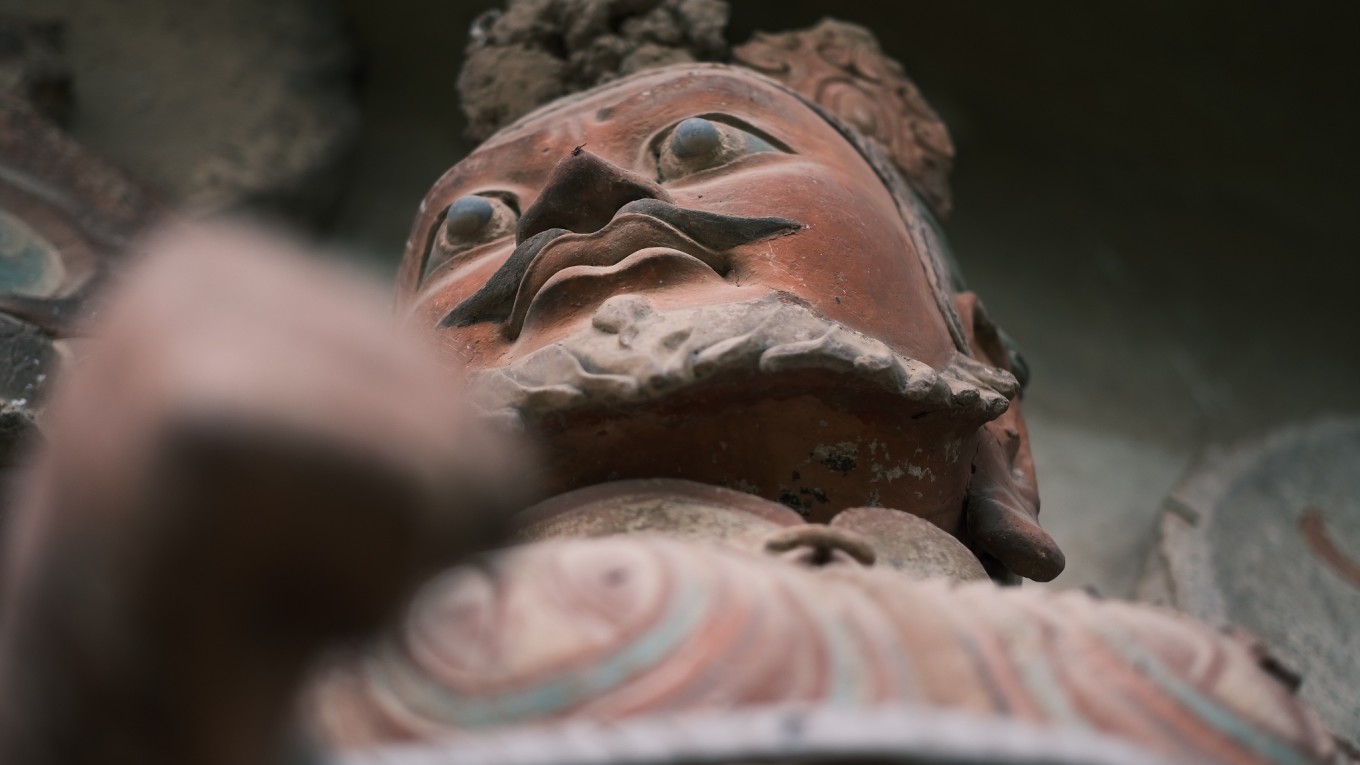 牛儿堂(5窟),因牛赎而得名的,它要吼一声就会大地震,动一下就要灭绝世界。一场灾难就要降临到人类了,但是没有起来,因为天王把它压住了,保护了一方平安,这就是下图的天王,鸠摩首罗天 - 踏牛天王,而他脚下踩着的就是牛赎而。这位天王是唐初的作品,这就已经和4窟的金刚的雕刻手法不太一样了。