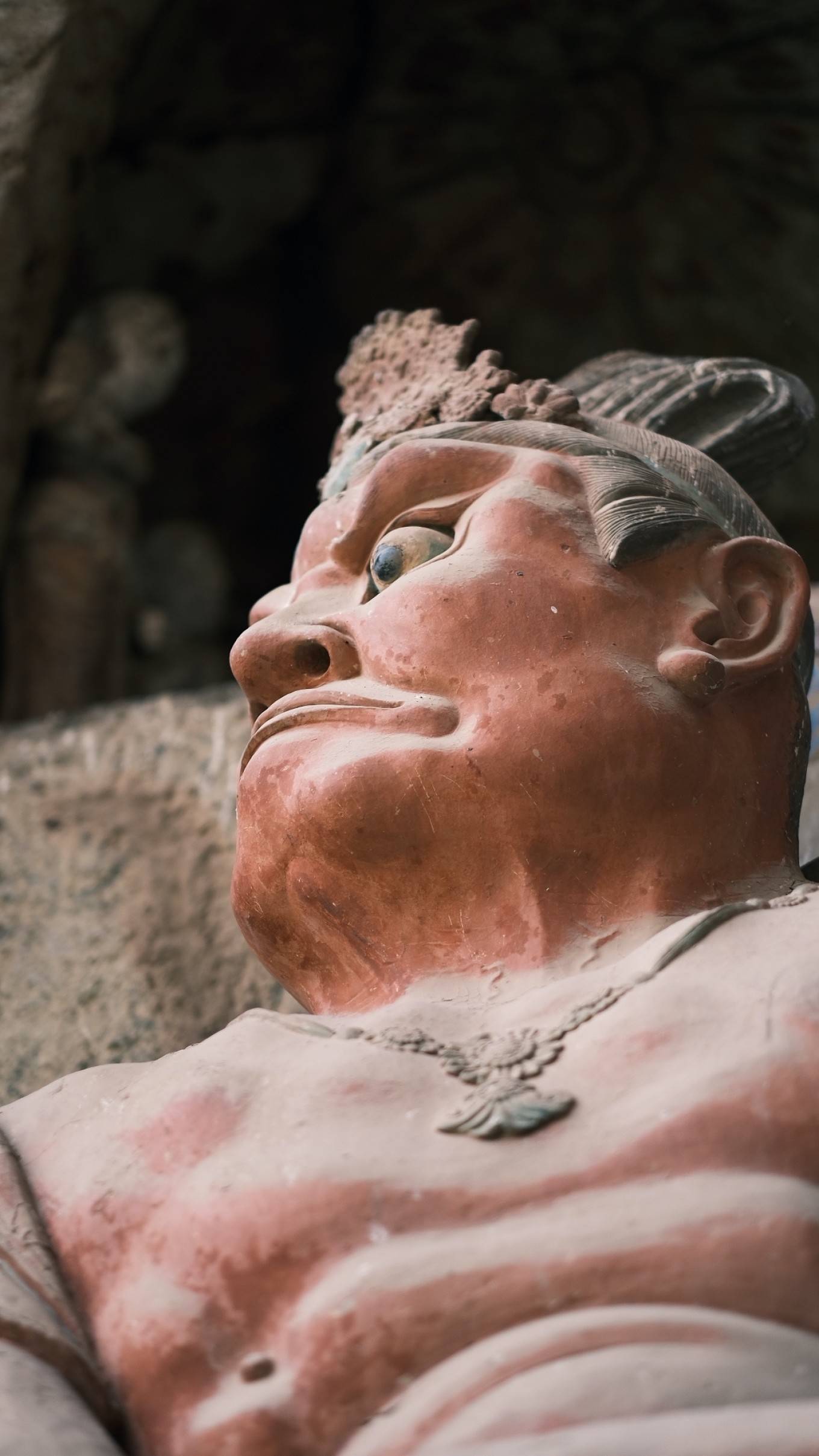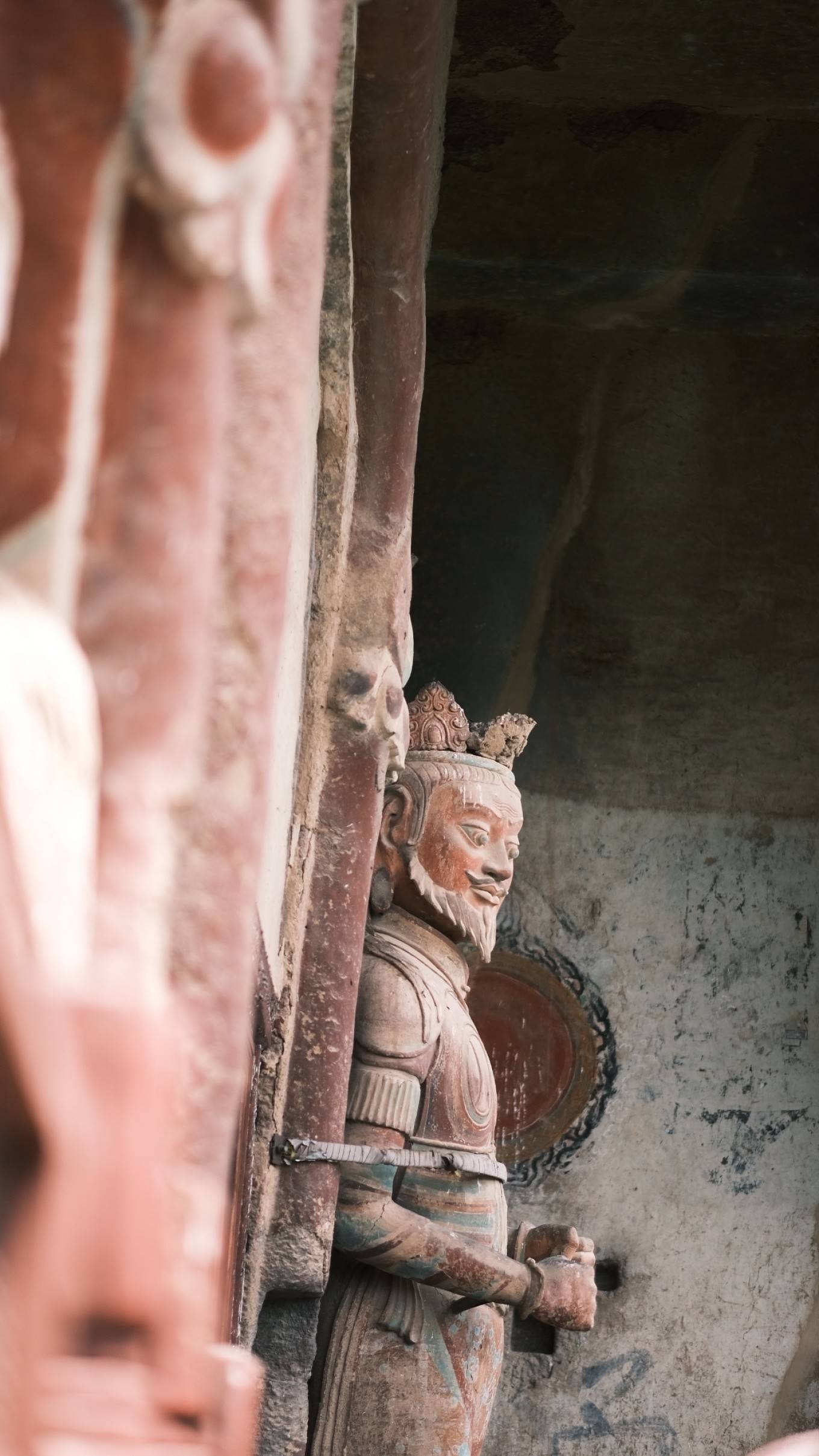 这是一段上七佛阁的铭文,通过铭文的描述我们能看出来,当年秦州都督李允信为王父祈福而开建的这座七佛阁时的盛景。我们熟知的“散花楼”、“是无等等”牌等著名的造像都在这座“上七佛阁”中,这是4窟。虽然我也在做攻略的时候看到了很多相关的相片,但是真实地到达现场,还是满眼的震撼。佛像栩栩如生,静中有动。所有的衣饰都是飘逸灵动的,衣饰的纹样,放到现代也是很有特色且具有现代审美的;神佛的肌肉线条塑造有厉、有力,七佛阁两侧怒目的宋代金刚,肌肉线条流畅又紧绷,站在金刚下侧仰视,清晰可见脖子上的青筋暴起,仿佛下一秒拳头就会落下。