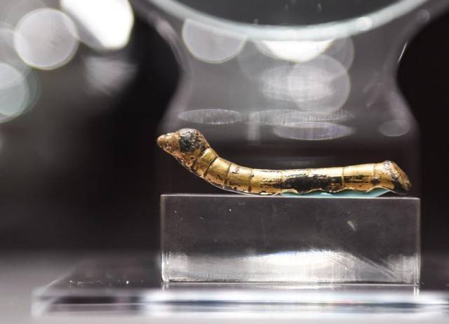 这条“鎏金铜蚕”1984年出土于陕西石泉县,首尾共计9个腹节,制作精致,造型逼真。新华社记者 罗晓光 摄