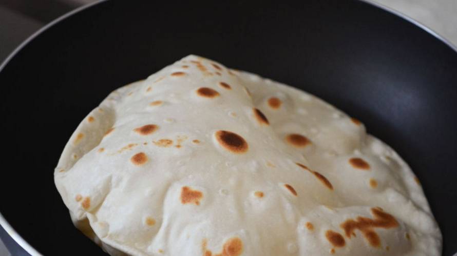 1,取一平底锅,中火烧热放入捍好的饼皮烙一下,翻面烙至中间鼓起,从中间撕成两张.