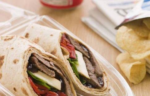 2,取一张饼皮擦上适量甜面酱,放上葱段、生菜,红甜椒和牛肉薄片卷起即可。