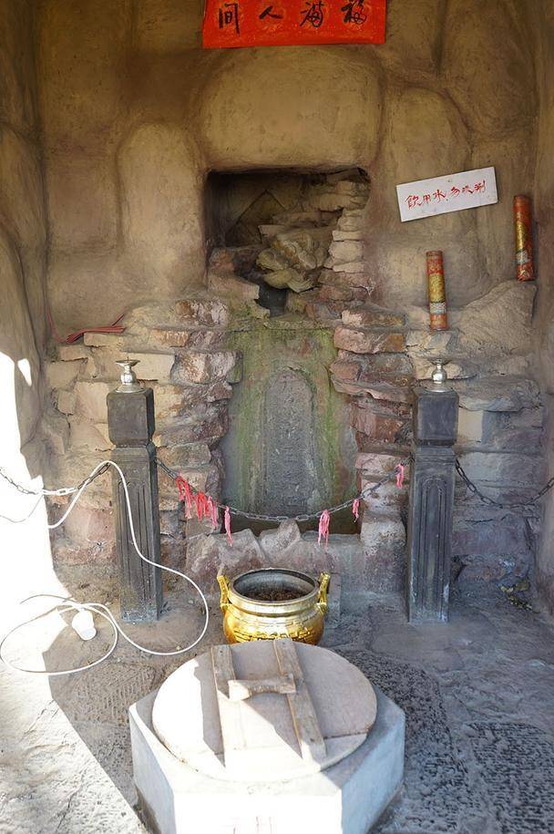 停车的位置有一座小巧的井龙王庙,紧靠路边,题额为四个金字“井龙神泉”。庙虽然是新的,但是里面出水的龙头却是很有年头了。