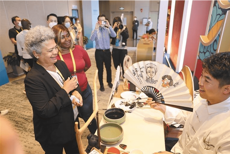 来自格林纳达的苏琳·玛利亚·劳楚彤告诉画师,自己想要一个头像画扇。画师欣然取笔,蘸墨作画。她看着,表情从好奇变成惊喜。扇面画成后,她鼓掌点赞,并与画师合影留念。