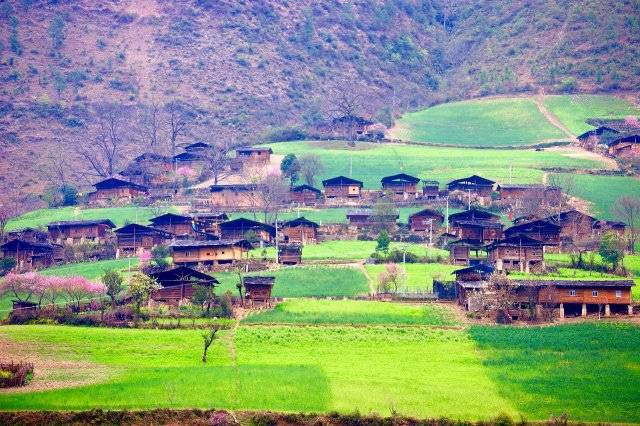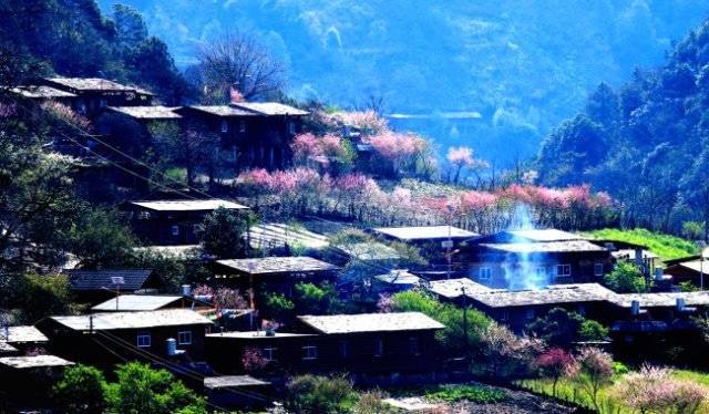 这个纯粹得只剩桃红烟云的地方,连房屋都还保留着木瓦的传统。层层梯田青黄交织,阡陌相通之间,从自然的静谧踏进了凡世的烟火。世代与桃花结缘的村民,至今还保留着过桃花节、祭桃花神的古老习俗。