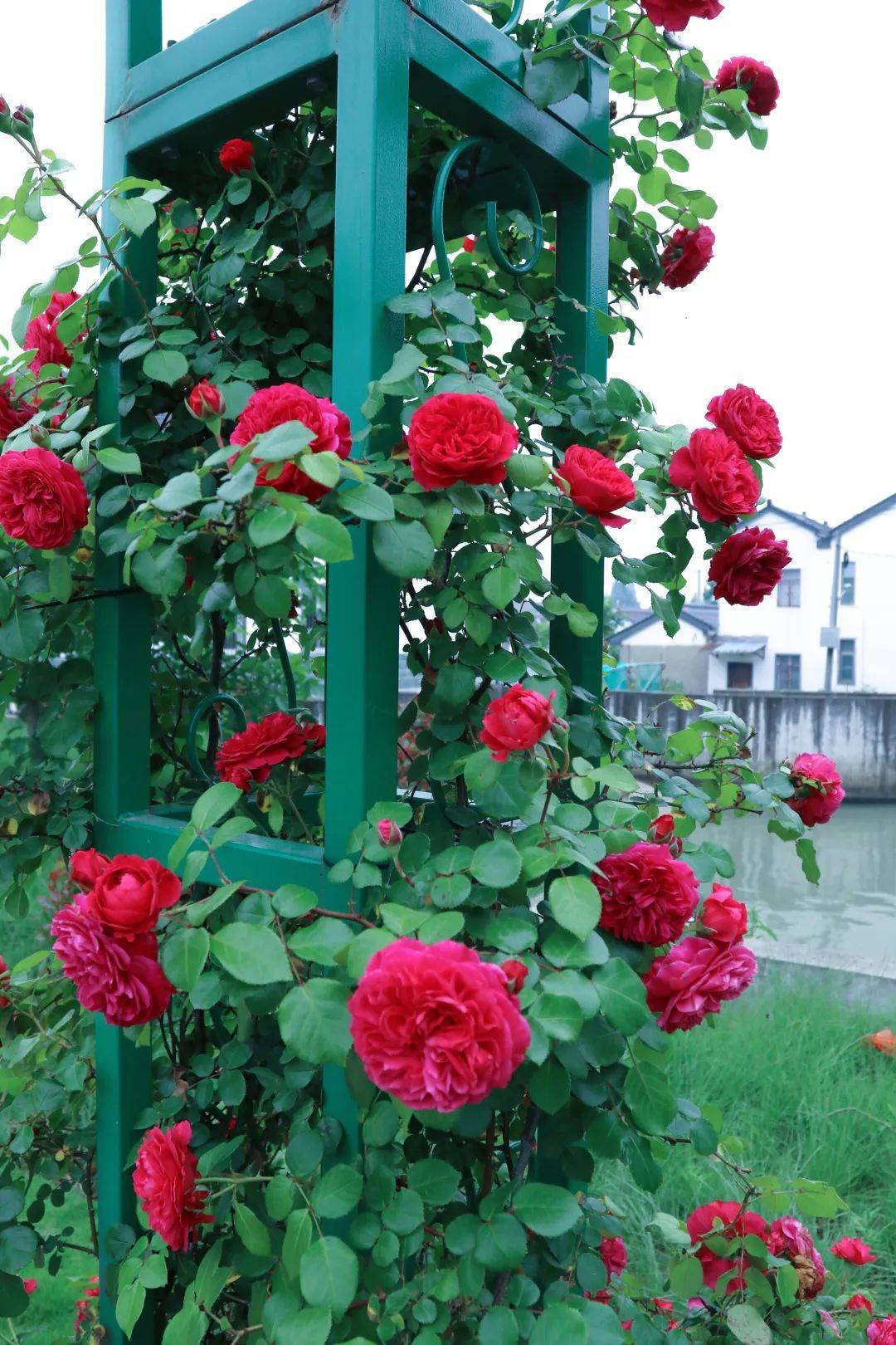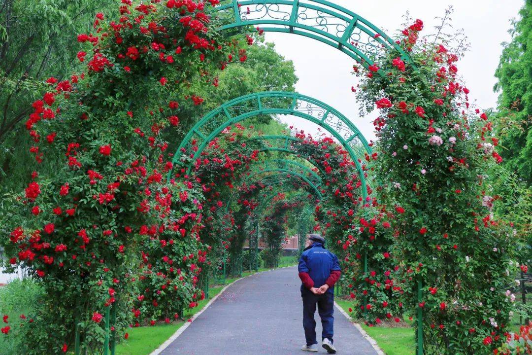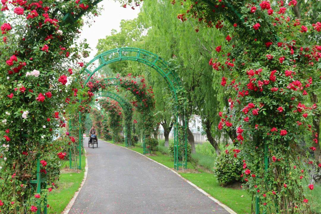 五月芳菲,静润浅夏。“藏”在东厍村东团、红旗塘畔的月季花道迎来了一年中最美的时节。入目皆花影,十余个拱形门之上,娇艳欲滴的藤本月季开满枝头,花香四溢。微风拂过,片片花瓣随风起舞,吸引着村民、游客前来赏花游玩,好不惬意。