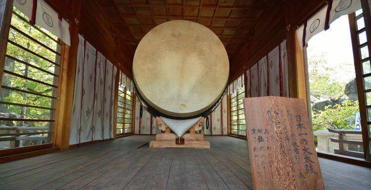 宫地岳神社有三项号称日本第一,其一是太鼓。直径超过两公尺的这座太鼓不仅巨大,而且从鼓身用的桧木、铜制的零件,以及鼓面的牛皮,都是使用以前的材料。其中又以鼓皮最为珍贵,因为在当时要找到体型够大的和牛,从而取得牛皮制作也是非常困难的事情。