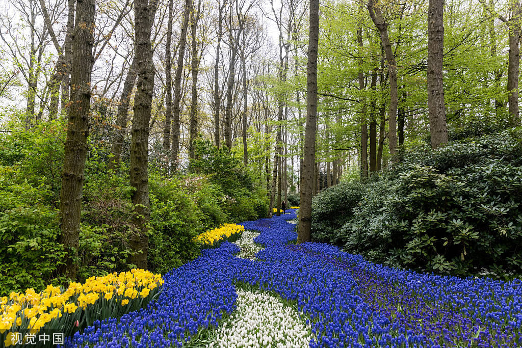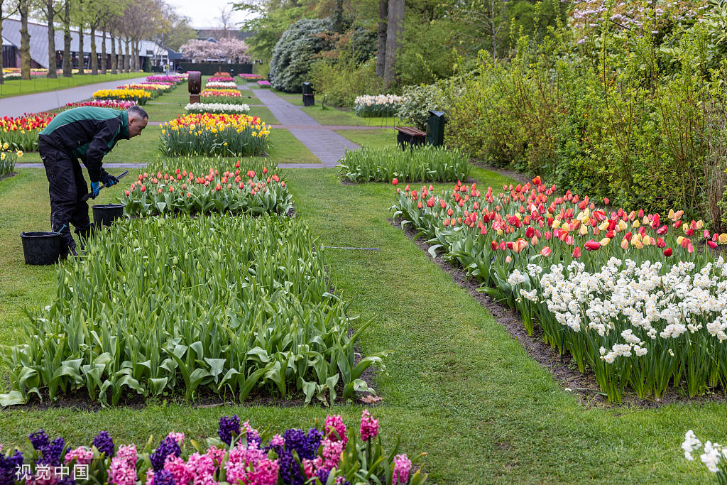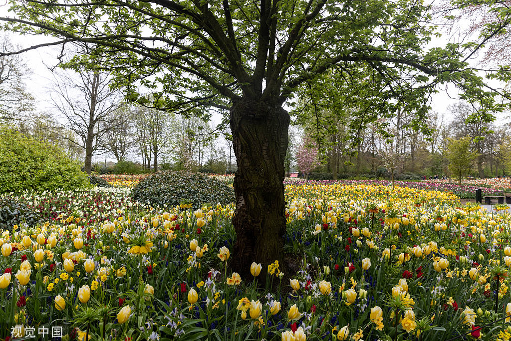 占地32公顷的园内,种植了1600多个品种的700万株球茎花卉,每年播撒的种子达7000公斤以上。郁金香是荷兰的国花。但郁金香可不是想看就能看到的。一年四季,位于阿姆斯特丹附近的全球最大的球茎花园——库肯霍夫公园(Keukenhof)只开放两个月左右。图为5月14日,荷兰利瑟,库肯霍夫公园的郁金香花丛。
