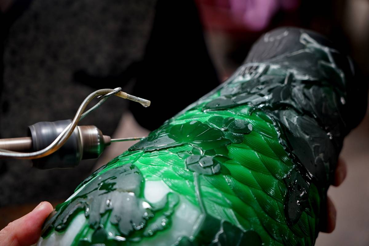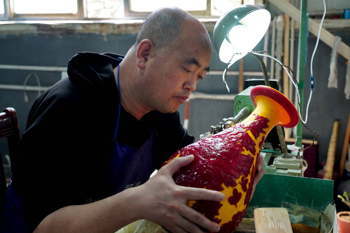 我们走进第一个车间,看见三位师傅正在雕工打磨,在大花瓶上似一层层的剥离和切割,琉璃雕刻是技术含量很高的技艺,三位师傅年纪都不小,看来是业界老师傅了。