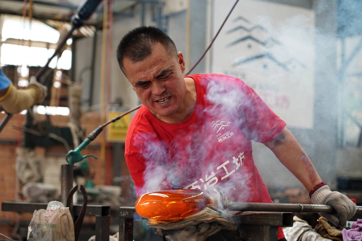 第二个车间比较大,有十几个工人来回走动,不停的给手里的琉璃原料加温然后造型,再加温,再造型,一件产品需要往复多次才能完成。