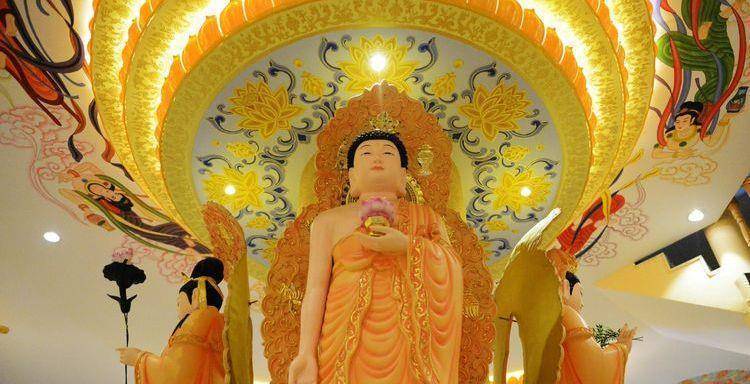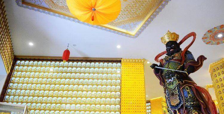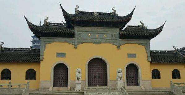 随后,便是第三正殿大雄宝殿,殿前的门匾据说是出自张謇之手,他是南通的状元郎,在正梁的上方还有般若妙源四个大字,屋顶处有一条黄色的龙脊,这是用陶瓷烧制而成的,长达20多米,有2米之高。当阳光照射时,距离很远都可以看到。殿内供奉着三尊大佛,分别是释迦牟尼佛、药师佛、阿弥陀佛,在两侧还有十八罗汉像,大佛背后则是观音像。