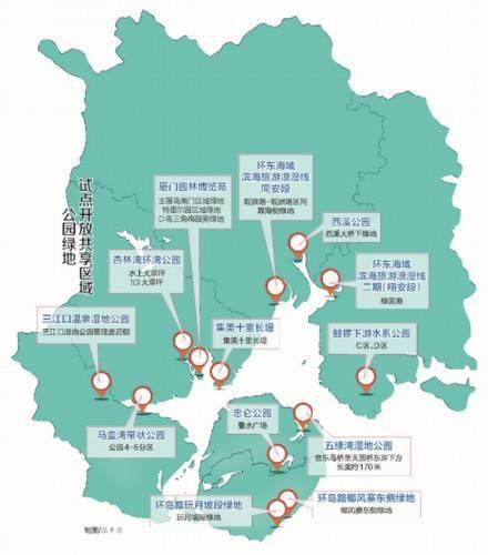 这些绿地,有的在环岛路、集美十里长堤、滨海浪漫线等旅游景点周边,有的在园博苑、忠仑公园、五缘湾湿地公园等人流量较大的公园内部。共享试点绿地较为开阔,草木繁茂,景色优美,有些绿地就在海岸线沿线,滨海浪漫风光一览无余。
