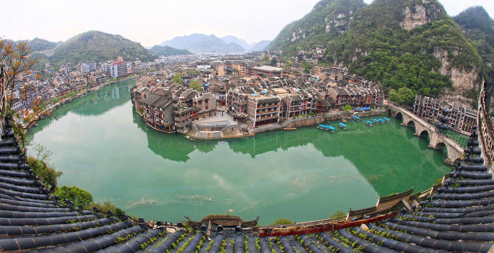 镇远古镇中有一条河流穿镇而过,名为舞阳河,并且在建立之初这里就充分融合了风水学,因此这里是按照太极图修建而成的古镇,这条河流就以s型流经此地,将古镇分为南北两岸,分别是旧府城和旧卫城,因此当人们立于山峰之上向下望时,便会发现一个完整的太极八卦图形,由于这里的山峦分布较多,山水交相辉映,景致十分特别,也正因此使这里被称为“东方威尼斯”。