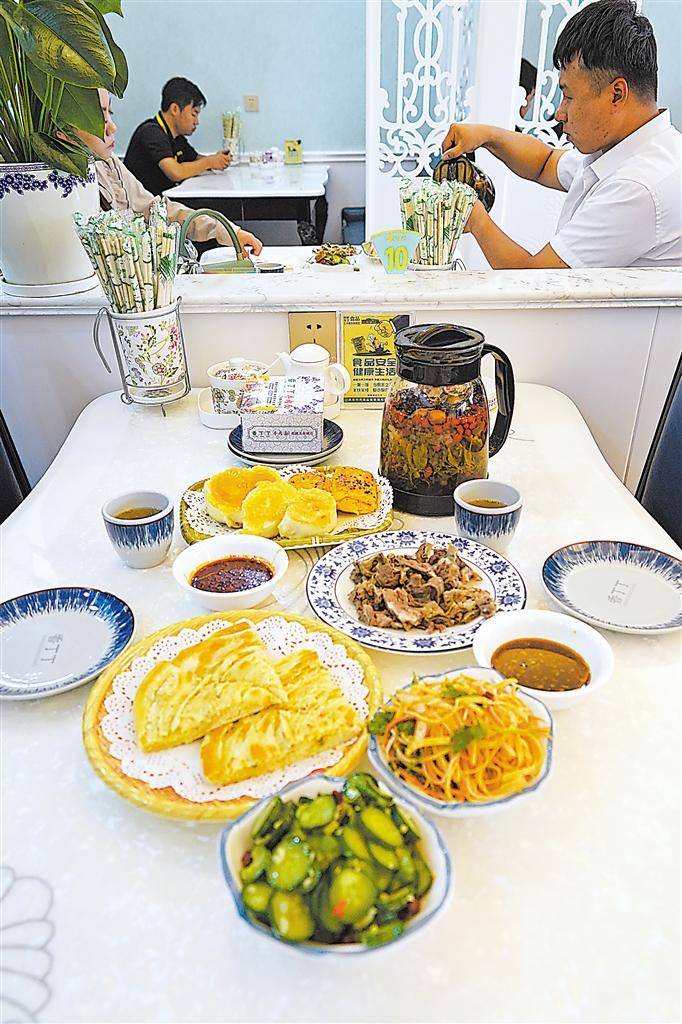 一壶蜂蜜玫瑰酱八宝茶,六道凉菜,四盘面点,一盘凉牛肉,一盘热牛肉,一人一碗拉面,一盘鸡蛋,早茶拉面套餐触动着食客的味觉神经,笑声朗朗,休闲惬意。悠长的日子,在一壶又一壶的八宝茶中慢了下来。“4月26日,我就预订吴忠早茶拉面体验店卡座,依然费了不少周折。”银川游客李萍5月1日和亲朋相约,品鉴吴忠早茶拉面文化。