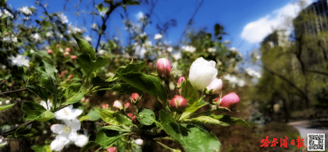 榆叶梅比较常见,在植物园、儿童公园、群力体育公园以及香坊区劳动公园,都有它的身影。其实,果树花常常易被人忽视,花期短,却也美得惊艳。劳动公园内的沙果花,只在春夏之交花开,花蕾时期呈粉红色,开花后色退而带红晕,清新浪漫又纯净美好。这种花,如肌肤美白的少女面露红晕一般好看,记住春夏交替时开花,想“一睹芳容”的抓紧时间来公园欣赏。