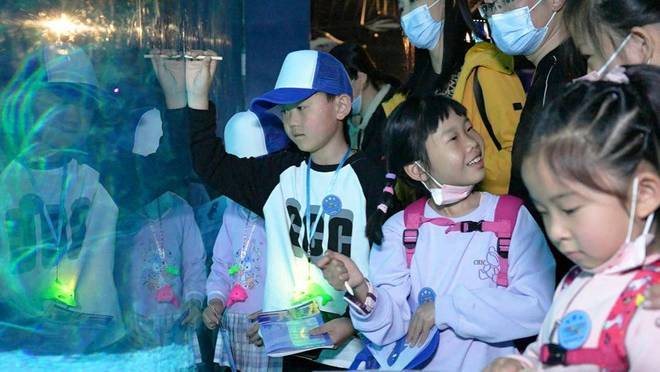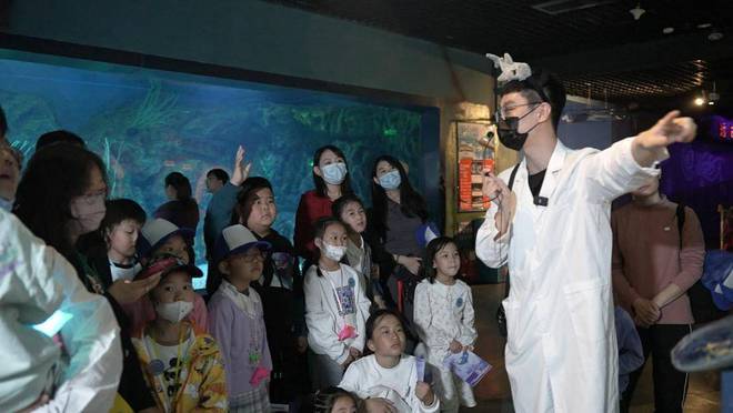 夜幕降临,科普讲师在萌兽湾跟孩子们以科普问答的方式,近距离分享海豹、海狮生活习性。在魔法海洋,大家沉浸在绚烂光影中,体验深海的斑斓壮阔,感受生命的礼赞。返回到酒店中,大家围坐一起,通过电影继续汲取更多海洋的知识,收获满满。
