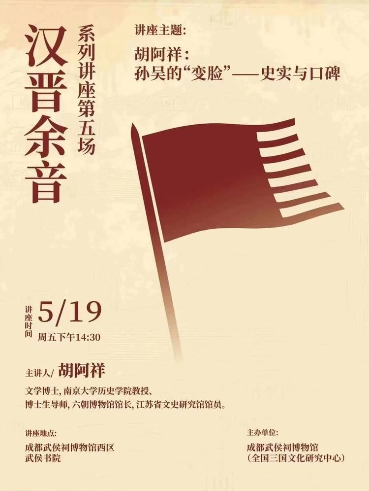 5月19日下午2:30,南京大学历史学院教授、六朝博物馆馆长胡阿祥将在武侯祠博物馆西区·武侯书院开讲《孙吴的“变脸”——史实与口碑》,从空间与时间、历史与演义、道德观念与社会价值等多维层面,梳理孙吴的“变脸”过程,解析其中之旨趣。