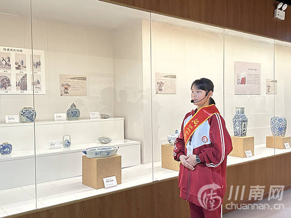 学生志愿者为领导、嘉宾、家长讲解博物馆为“5.18”国际博物馆日原创临展“邀您共赏青花瓷”文物