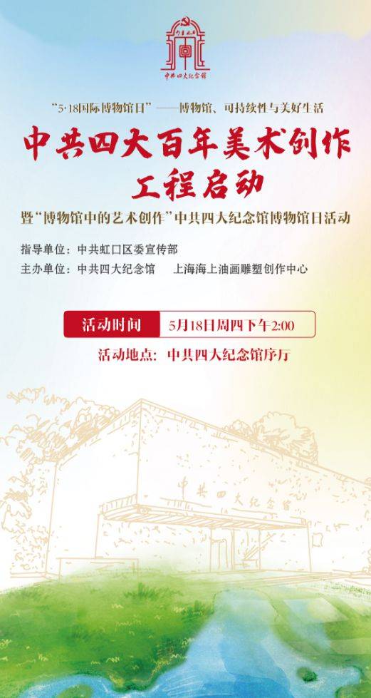活动简介:邀请曾为中共四大纪念馆、国旗教育展示厅、左联会址纪念馆、李白烈士故居等场馆进行艺术创作的一批艺术家交流座谈。活动当天,“学习党的二十大 中共四大漫漫说”连环画、漫画主题展也将揭开面纱,并启动中共四大百年美术创作工程。