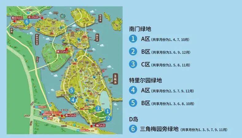 例:如园博苑选择三处试点,其中南门绿地分三区,A区共享月份1、4、7、10月,B区共享月份3、6、9、12月,C区共享月份2、5、8、11月,按照月份开放。在非开放期间将对损坏的草坪进行重新补栽等养护,确保草坪成活率,保证绿化效果。
