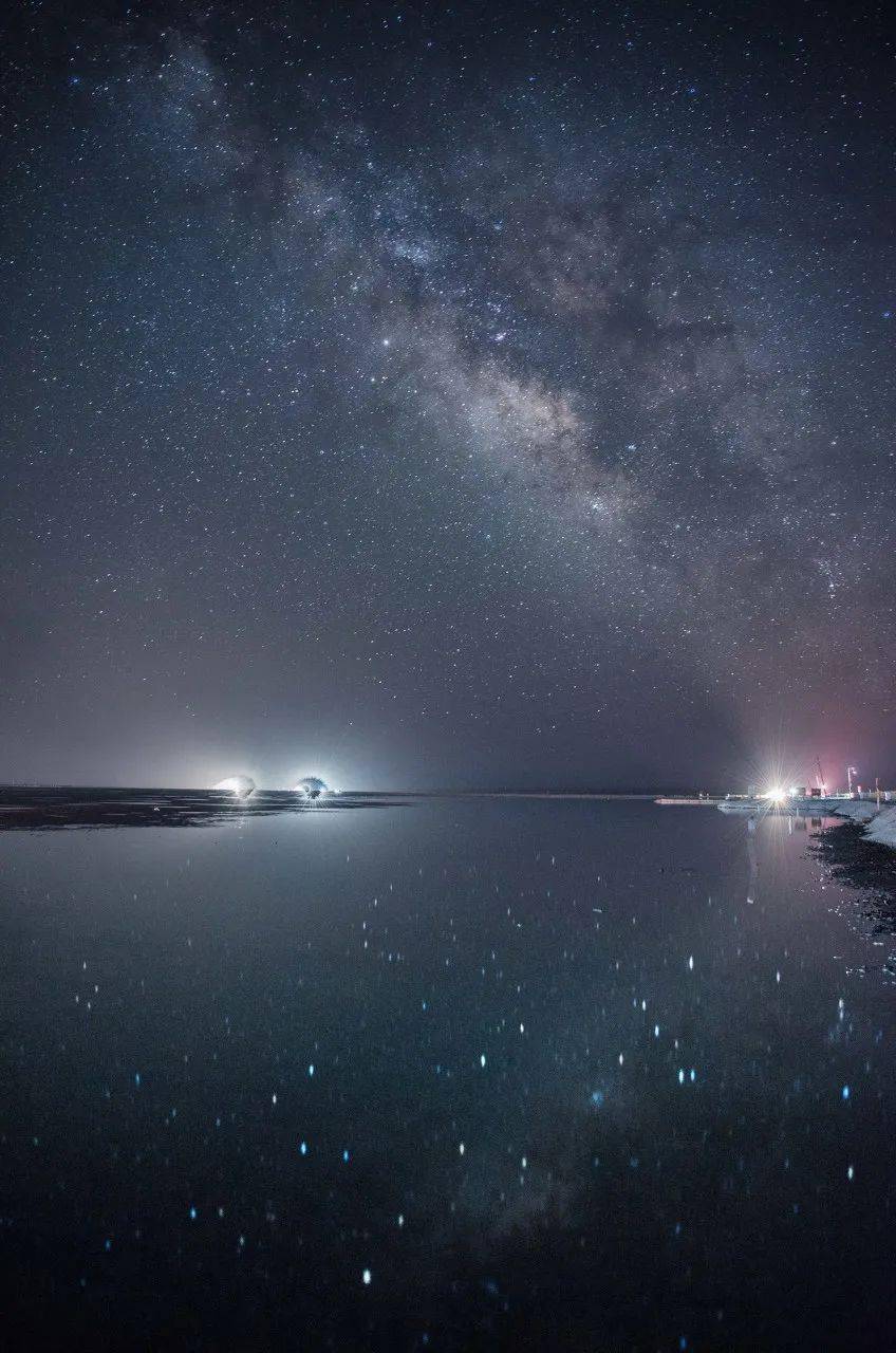 夜晚的茶卡盐湖倒映出一整面星空,抬头,低头,都是星河璀璨。