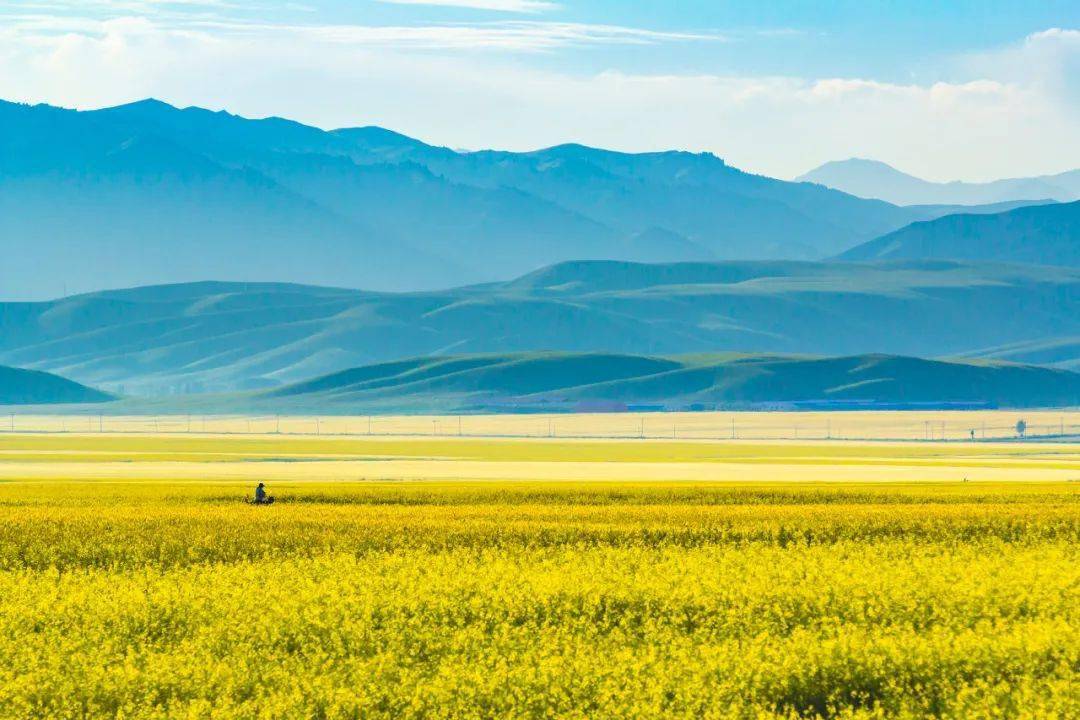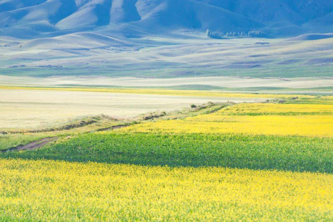 每年6月底,百万亩的油菜花盛开,便犹如一条巨大金色的织毯,与天山遥相辉映。