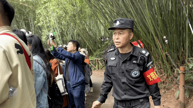 “不要大声喧哗、拍照不要开闪光灯”随着人群涌动的方向前进,熊猫基地保安胡洪刚一边组织游客有序观赏,一边提醒游客文明观赏。据悉,熊猫基地组织文明劝导员、志愿者等协助维护旅游秩序,为游客提供问路、咨询服务,对景区内不文明现象进行文明劝导。