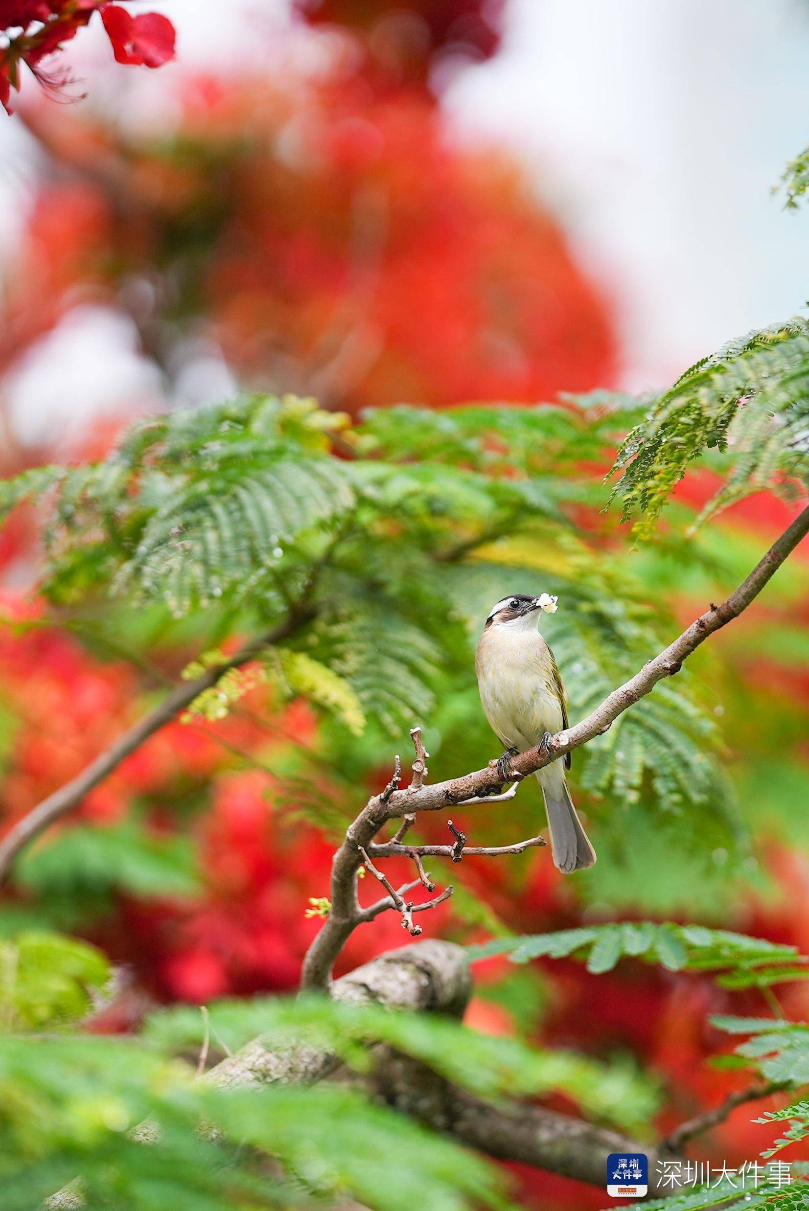 (在凤凰花间觅食的鸟儿)
