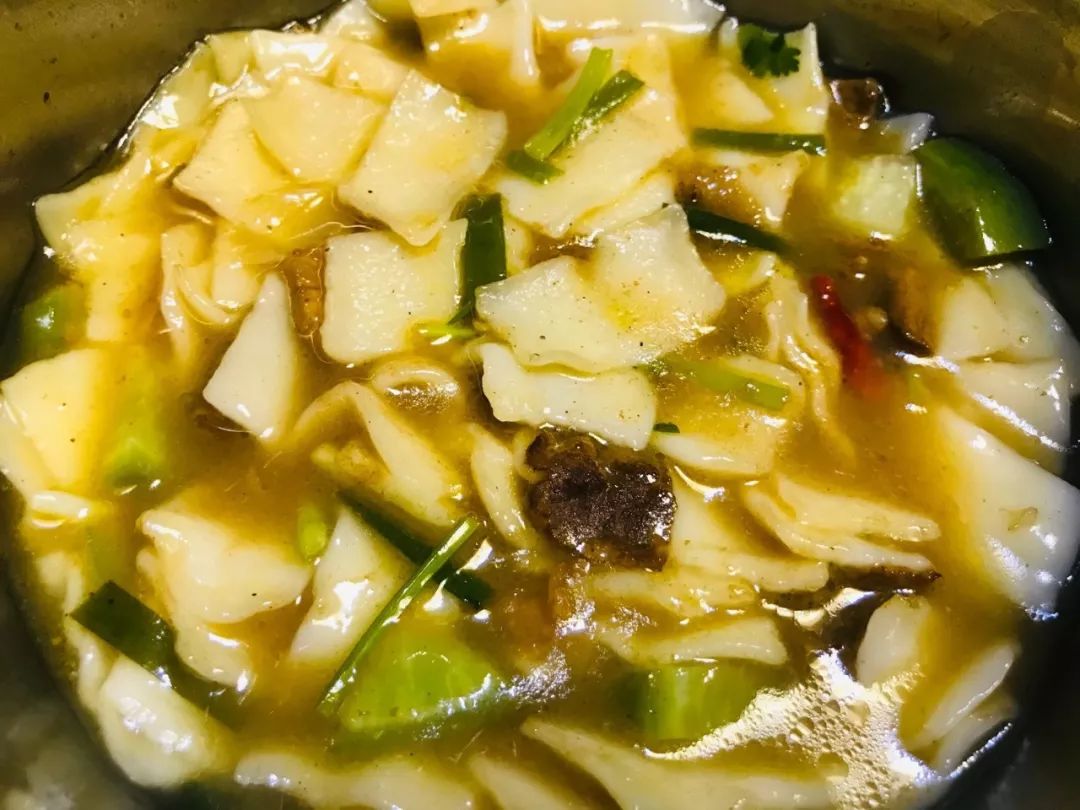 对于忙累了一天的农民来说,揪片子更能够满足对食物的欲望。揪片子的配料是根据季节来调整的,可荤可素,可酸可辣,所需食材也都是常见的,制作过程也相对简单,收工回去,女主人把袖子一卷,和面时顺手在给锅里烧上水,面擀好了,水也开了,把面条切成长条,一片片揪了丢进锅里,最后一片丢进锅里搅拌一下,前面的也就熟了,放上菜就是一碗美味的汤面。
