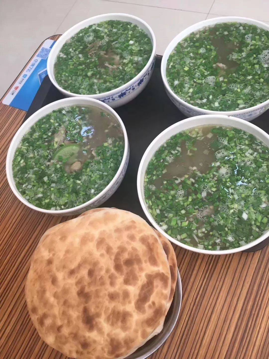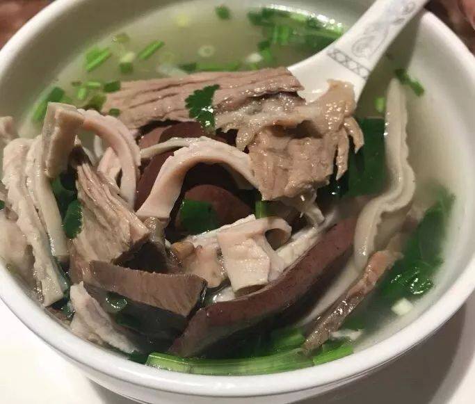 羊杂汤也是甘肃人的早餐之一,我个人喜欢吃的是嘉峪关老店河西鲍福记。煮好的羊肚、羊心切丝,羊头肉、羊肝、羊血切块,香菜、蒜苗切碎末备用。甘肃本地饲养的膘肥体壮羯羊骨头温火熬煮成汤。食用时把香菜、蒜苗末放入碗底,将羊杂、粉条盛入碗中,舀入沸汤,香菜和蒜苗的香味扑鼻而来,肚脆肉香,再配一嚼劲十足的大饼,大冬天吃上一碗,立马全身暖和,手脚不冰。