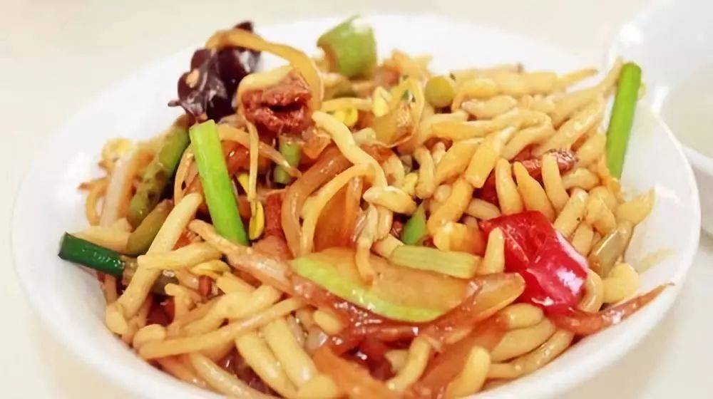 据说,到了张掖,不吃一碗炒炮根本就不算来过张掖,也叫炒炮仗子。说是它的形状,像过年放的鞭炮。把面搓成筷子粗的圆面条,揪成寸段,丢沸水中煮熟捞出,加蔬菜炒均匀,外加卤肉,就可以吃啦。张掖随便一家小食店进去,都可以点这道菜,最出名的是孙记炒炮,百年老店了。进店一般都能看到桌子上放有装着煮面汤的壶, 倒上一碗面汤,边吃边喝,原汤化原食。