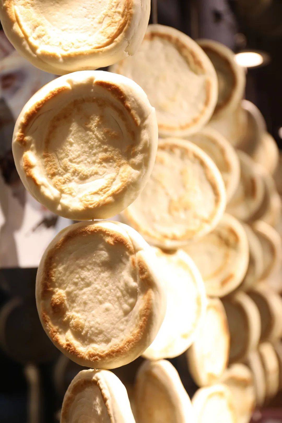 说是馍,其实是白吉馍。发好的面,手工揉制成形,现烤,讲究“铁圈、虎背、菊花心”(饼皮的颜色要像老虎的后背,饼的四周要圆如铁圈,馍的花纹得形似菊花心),馍不厚,但有嚼头。