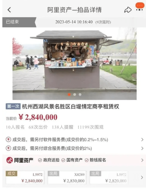 5月14日,经历了68次竞价,浙江杭州西湖风景名胜区白堤情定商亭租赁权以190万元起拍,最终以284万元成交引发关注。