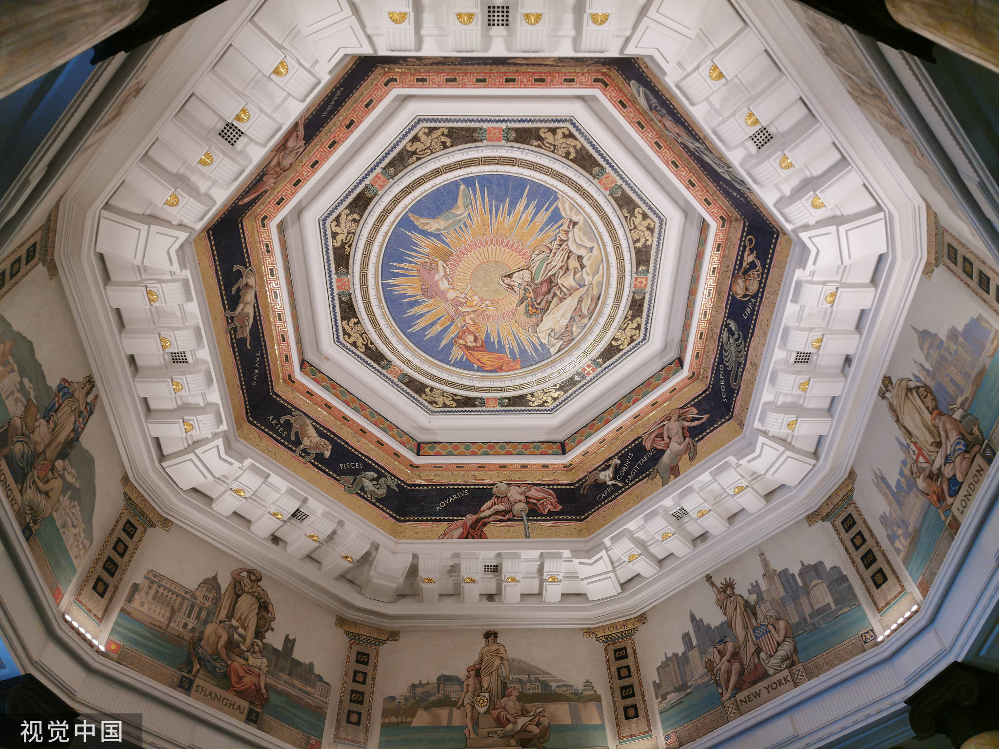 壁画分为三层,第一层是古希腊罗马神话中的太阳神、月亮神和丰收女神,第二层是十二星座,第三层是汇丰银行在上海、香港、伦敦等8个分行的建筑和背景。八幅壁画按照经纬度排列,站在八角厅抬头转一圈,就仿佛经历了一次环球旅行。
