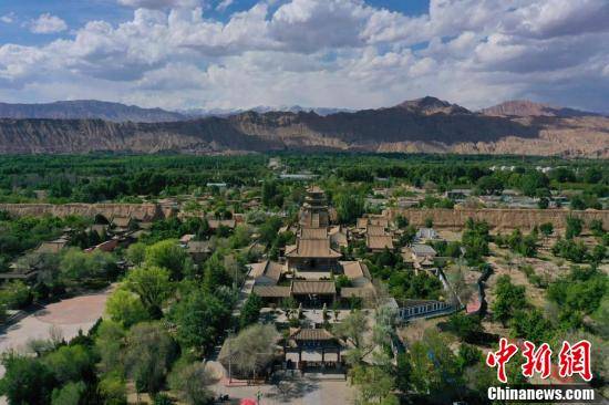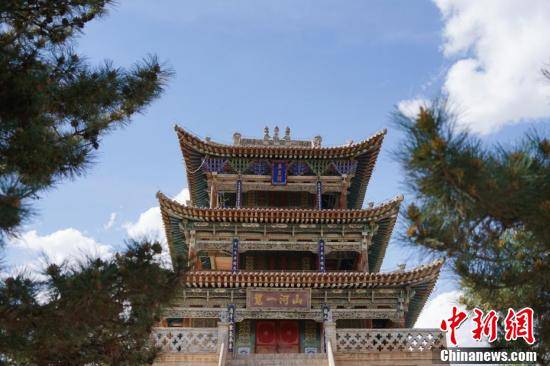 整体建筑群集“儒、释、道”三教为一体,规模宏大、布局严谨,内部碑刻、壁画具较高历史文物及建筑艺术价值。图为航拍青海省海南藏族自治州贵德县黄河岸畔玉皇阁。马铭言 摄
