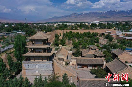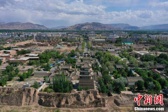 青海省海南州贵德古城距今逾600年历史,城内由文庙、武庙、玉皇阁、万寿观、大佛寺、城隍庙、民众教育馆、民俗博物馆等组成的明清时期古建筑群,总占地61亩,被列为国家级文物保护单位。图为航拍青海省海南藏族自治州贵德县黄河岸畔文庙及玉皇阁古建筑群。马铭言 摄