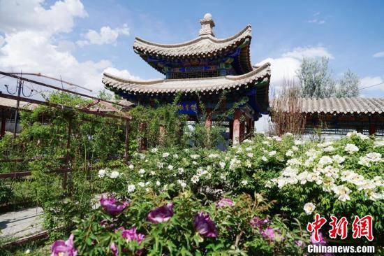 青海省海南藏族自治州贵德县黄河岸畔文庙及玉皇阁古建筑群文苑内牡丹花盛开。马铭言 摄